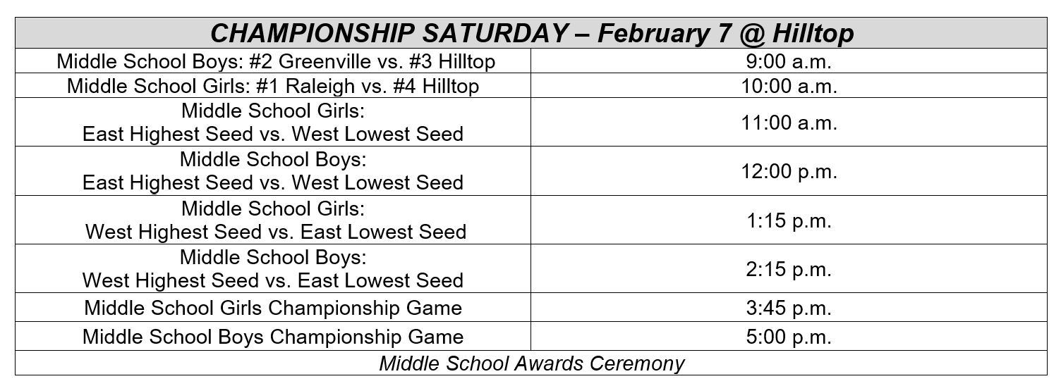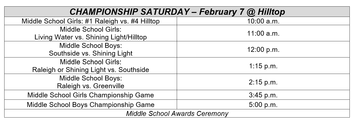 - CLICK HERE to view the 2026 NCCSA Middle School Championship Basketball Tournament Rankings and Schedule.